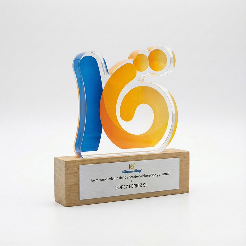 Los trofeos multimaterial combinan diferentes materiales (resina, metal, madera o acrílico…) para crear galardones modernos y distintivos que destaquen visualmente.